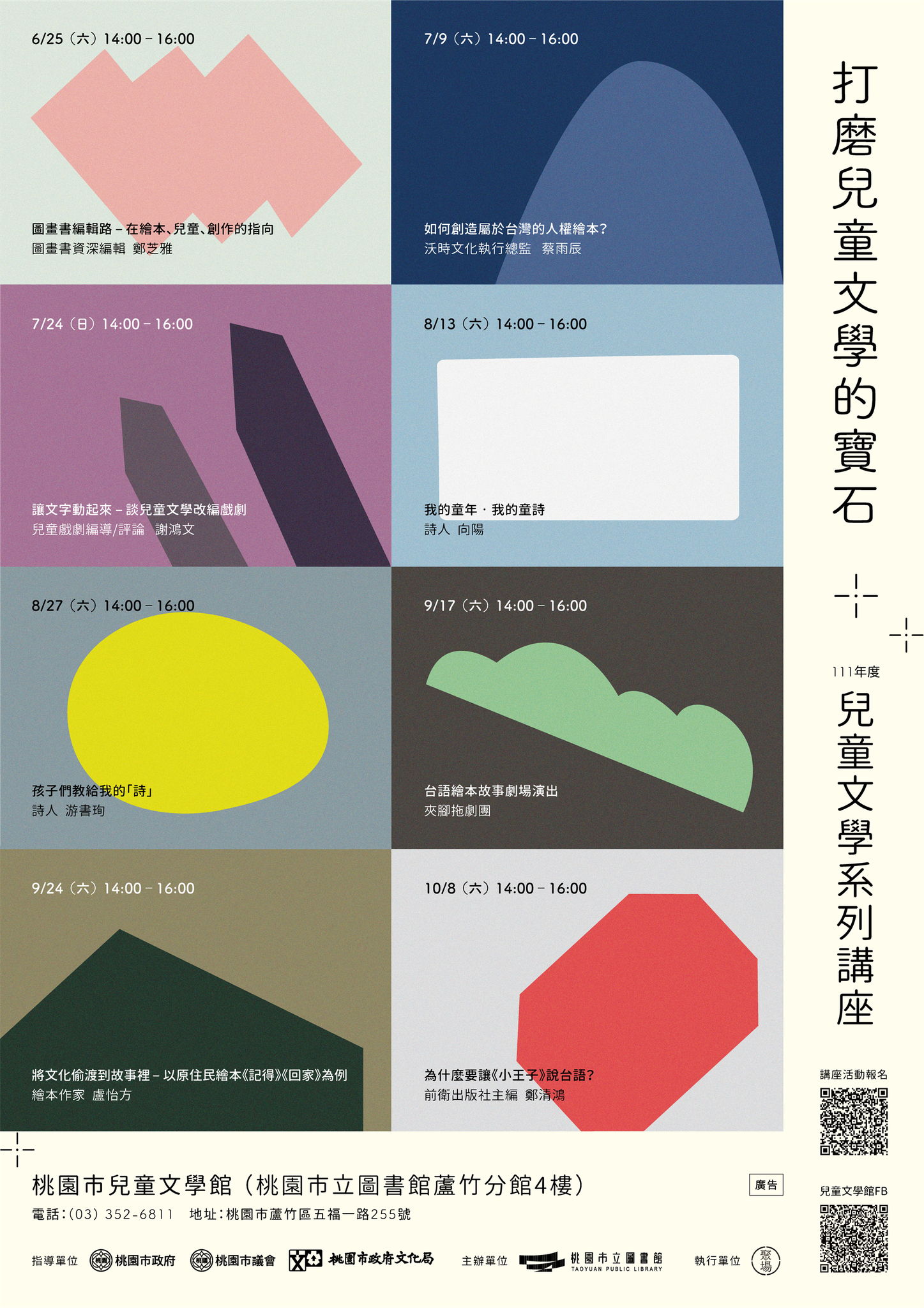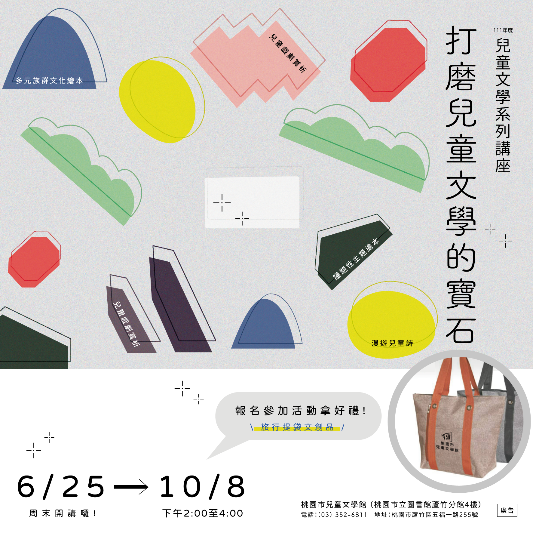 | 一、 | 本館為推廣兒童文學,開啟多元視野,提升學童想像力及閱讀能力,規劃於 111 年 6 月 25 日至 10 月 8 日期間辦理 8 場精彩講座,地點於桃園市兒童文學館(桃園市蘆竹區五福一路 255 號 4 樓),參加 6 月 25 日(六)講座即可獲得旅行提袋文創品 1 份,歡迎蒞臨參加。 |