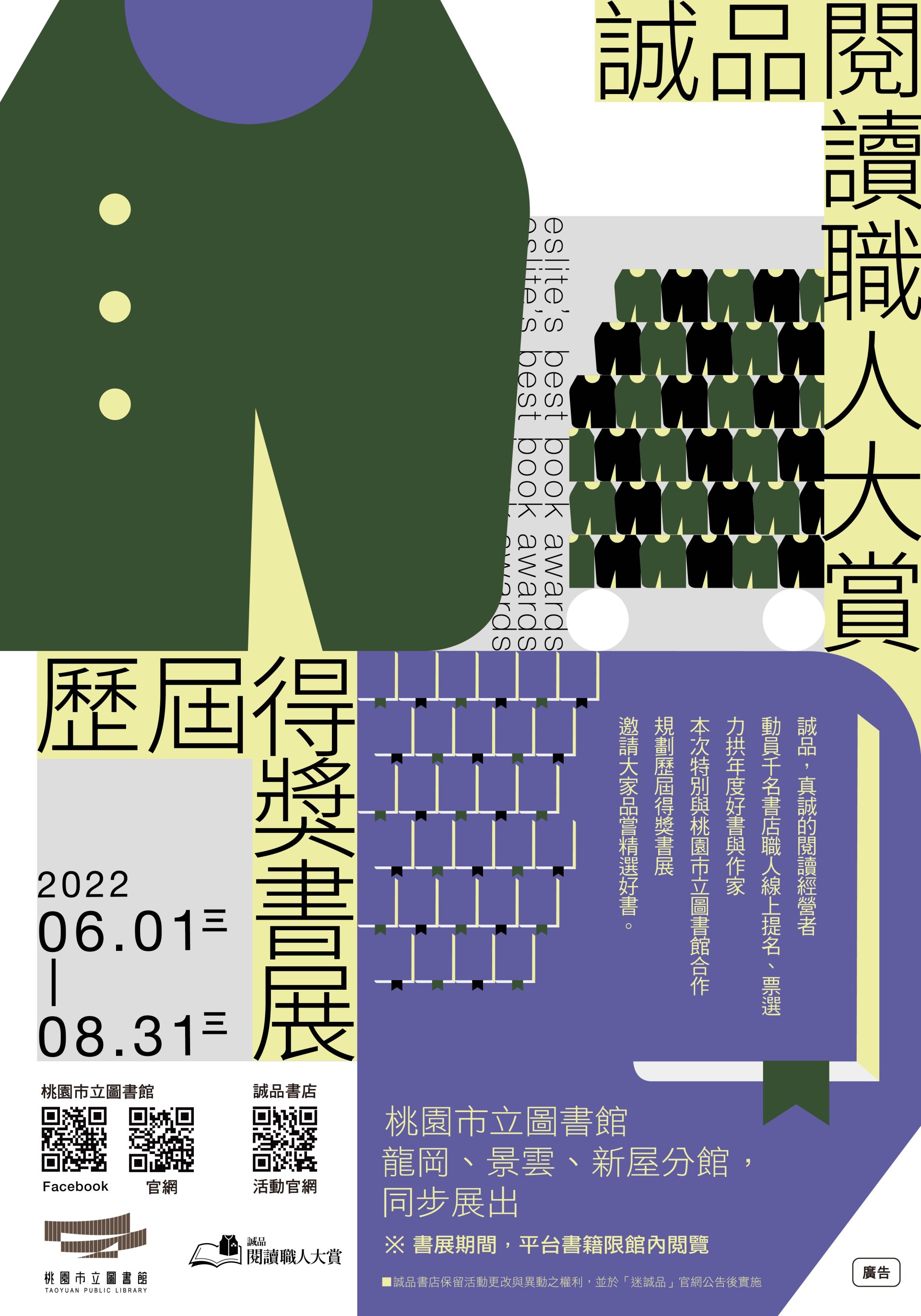 | 一、 | 旨案活動由主辦單位成品股份有限公司與本館合作串聯舉辦「2022 誠品閱讀職人大賞」得獎書展及作家講座系列活動,於 111 年 6 月 1 日至 8 月 31 日期間辦理得獎書展,並於 7 月 3 日、 7 月 9 日及 7 月 16 日分別辦理 3 場精彩講座,歡迎蒞臨參加。 |