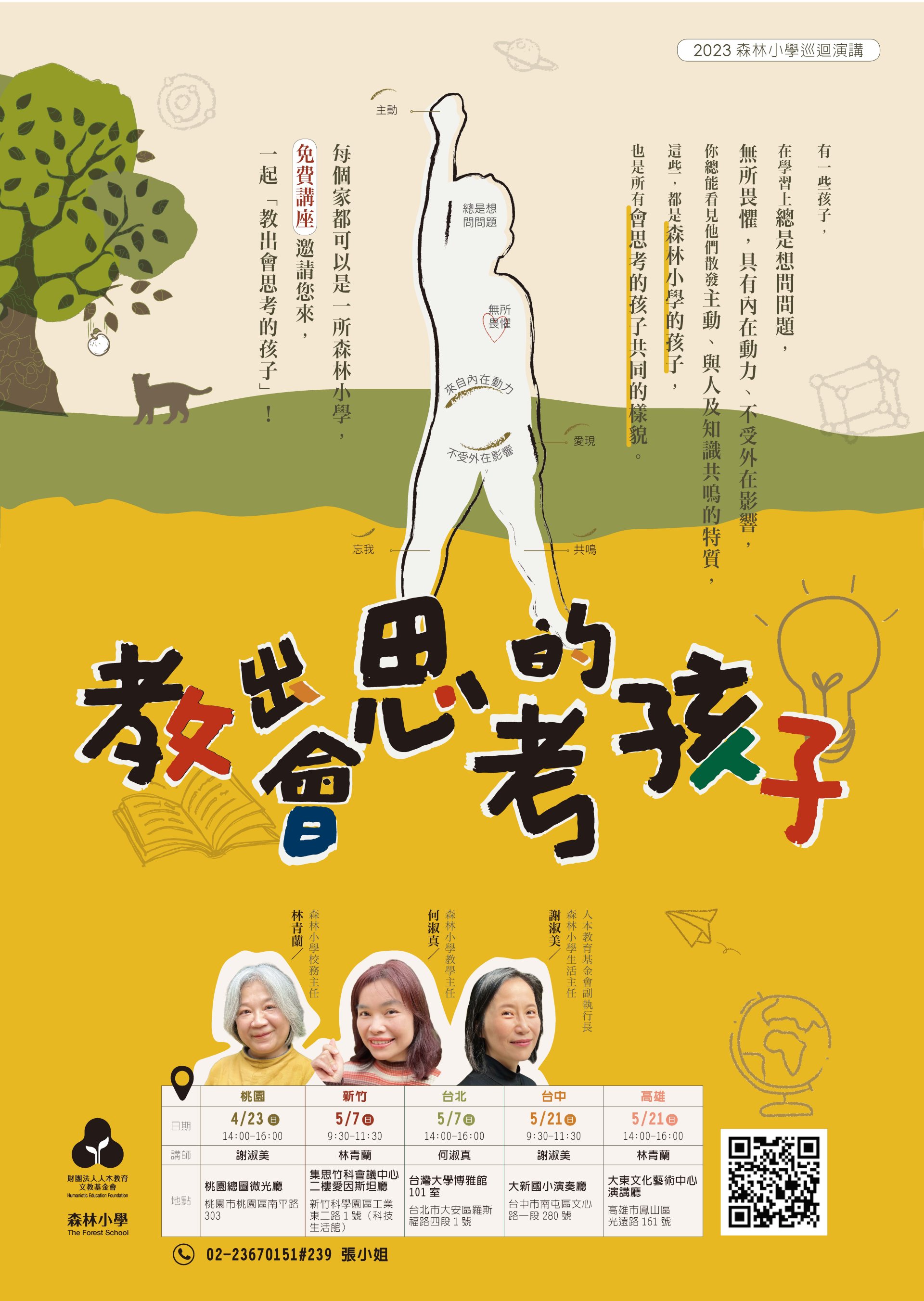 二、 | 本館與人本教育文教基金會合作舉辦「教出會思考的孩子-2023 森林小學巡迴演講會(桃園場)」,本講座將分享森林小學教學理念及方法,包含如何啟發孩子思考、激發動力、傳遞方法;如何藉由「玩的學習」,培育孩子「成為他自己」,散發主動、與人及知識共鳴的特質。活動資訊如下: |