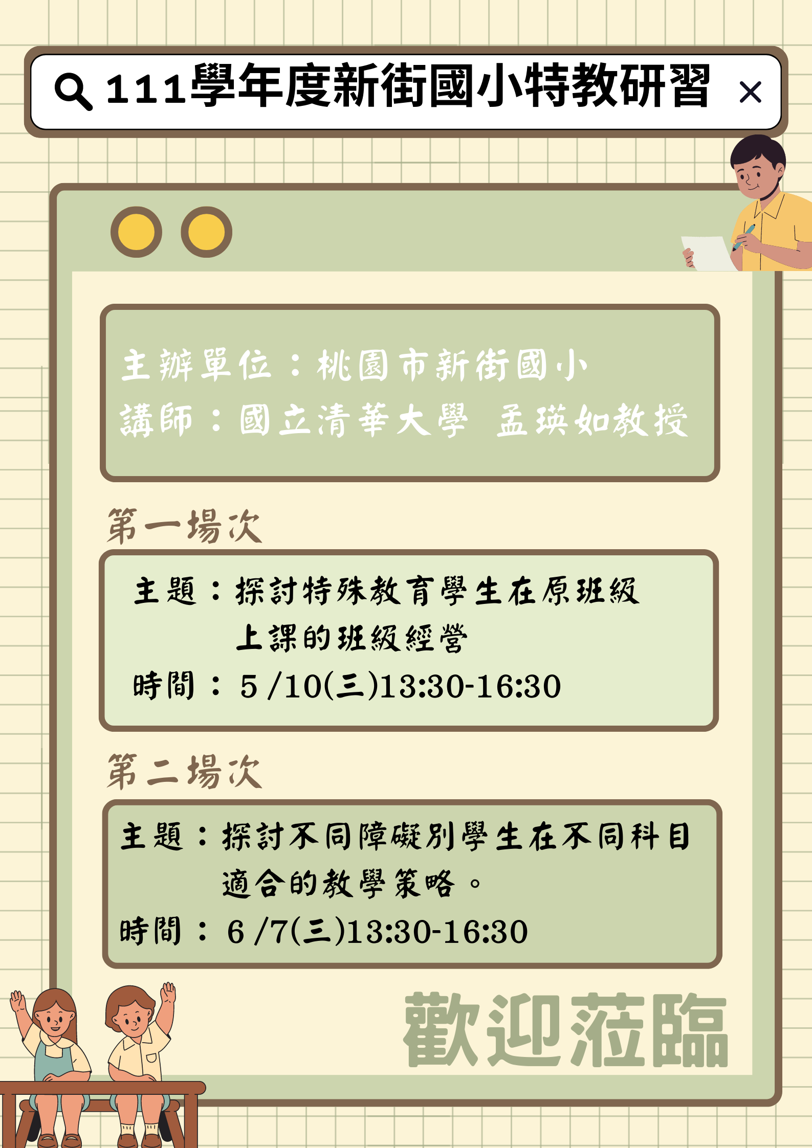 | 主旨: | 有關本校辦理「桃園市新街國小 112 年度特教學生依據個 別化教育計畫(IEP)分組教學策略模組研討工作坊暨教師多層次班級經營與教學策略研習實施計畫」研習,請鼓勵所屬教師及教師助理員踴躍報名參加,請查照。 |