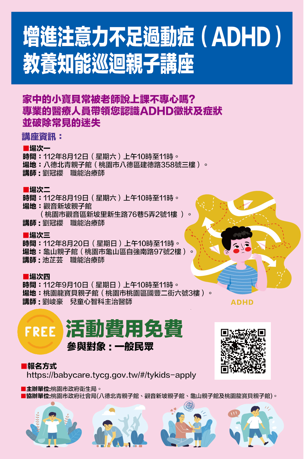 | 二、 | 注意力不足過動症( ADHD )是兒童期常見之神經發展障礙,為提升民眾及家長對注意力不足過動症( ADHD )之認識並知道如何尋求專業的協助,爰辦理旨案活動共計 4 場次,本次活動免費並採線上報名( https://babycare.tycg.gov.tw/#/tykids-apply)請各校廣為宣導,詳請參考附件計畫。 |
