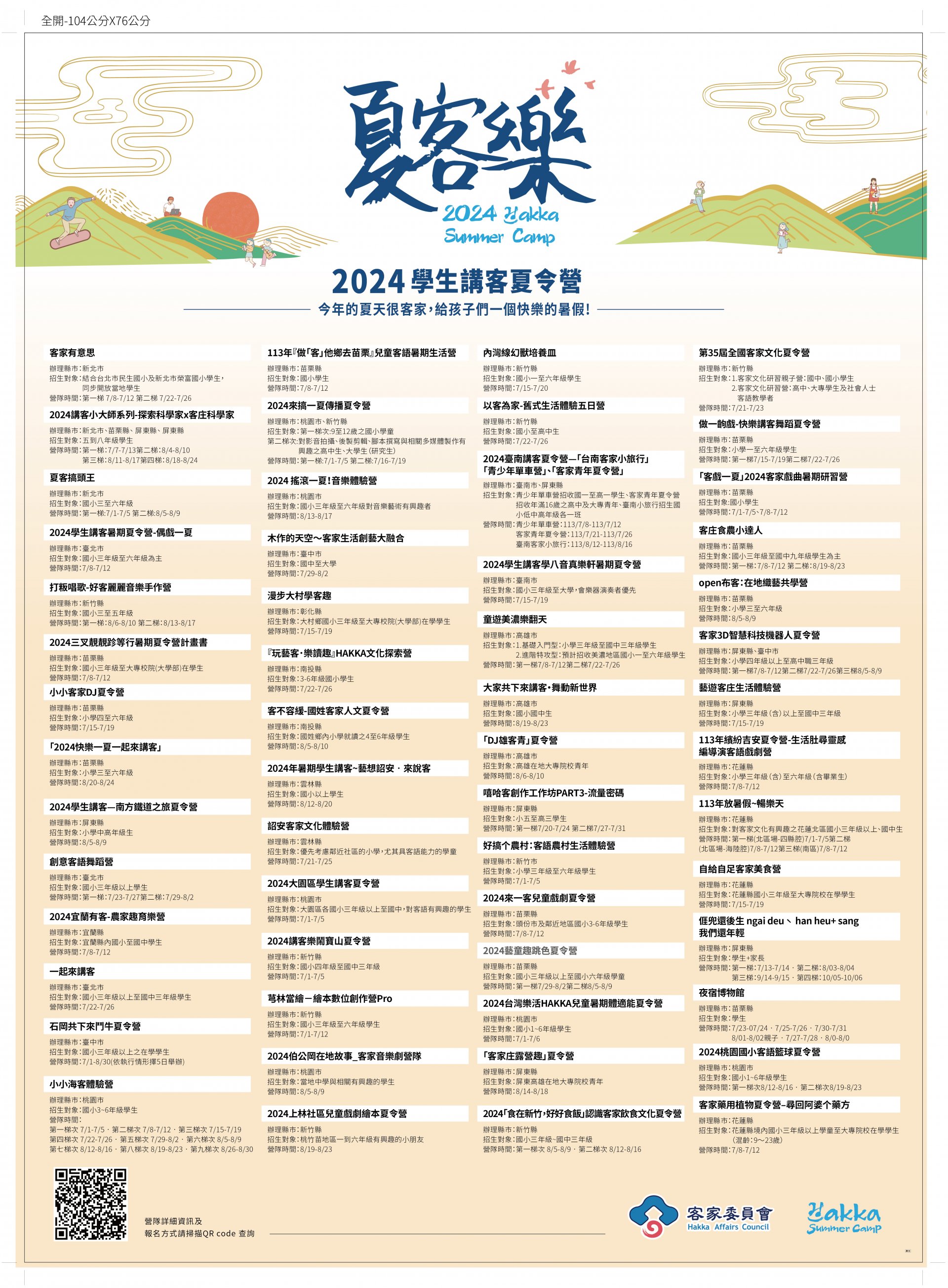 | 二、 | 該會為推廣客家語言,提升後生社群活力,本年度擴大結合地方政府、大專校院及民間單位共計辦理 56 個講客夏令營活動,包括客庄走讀、知識探索、手作體驗、創客技藝、數位科技及樂活運動等不同類型的營隊活動,期待透過多樣化的教學、參訪、體驗等方式,使各教育階段後生學子體驗瞭解客家語言及文化。 |