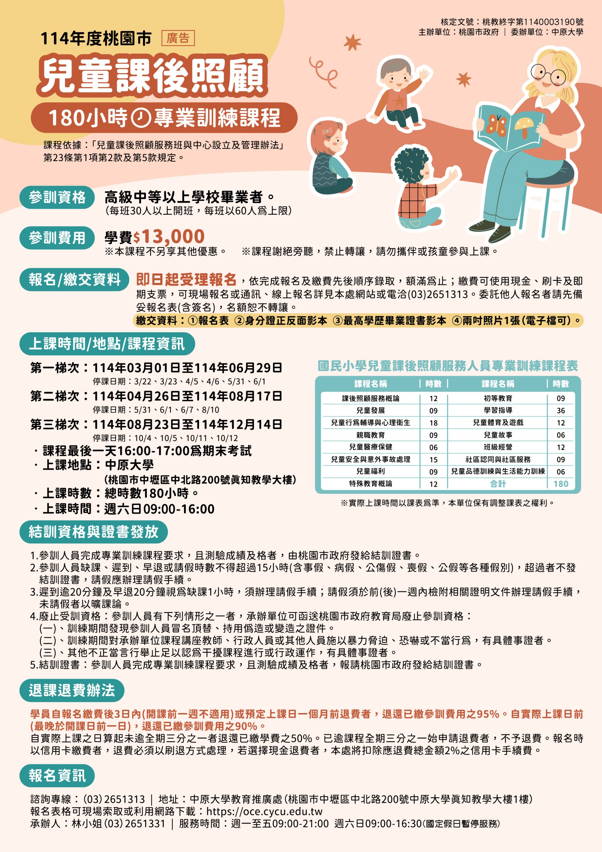 檢送中原大學辦理之「桃園市114年度兒童課後照顧服務人員180小時專業訓練課程」簡章及報名表各1份