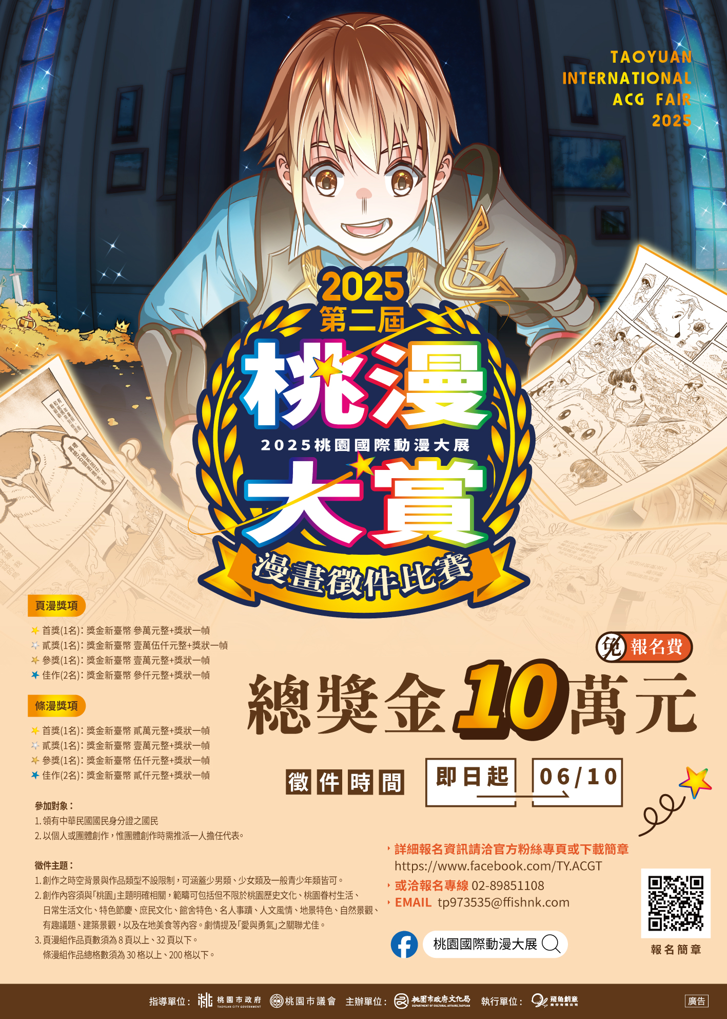 為發揚臺灣原創漫畫創作能量,給予全國漫畫有志之才展現能力的舞台,本局規劃辦理旨揭活動,報名時間自即日起至今(114)年 6 月 10 日 17 時止(以郵戳為憑)。