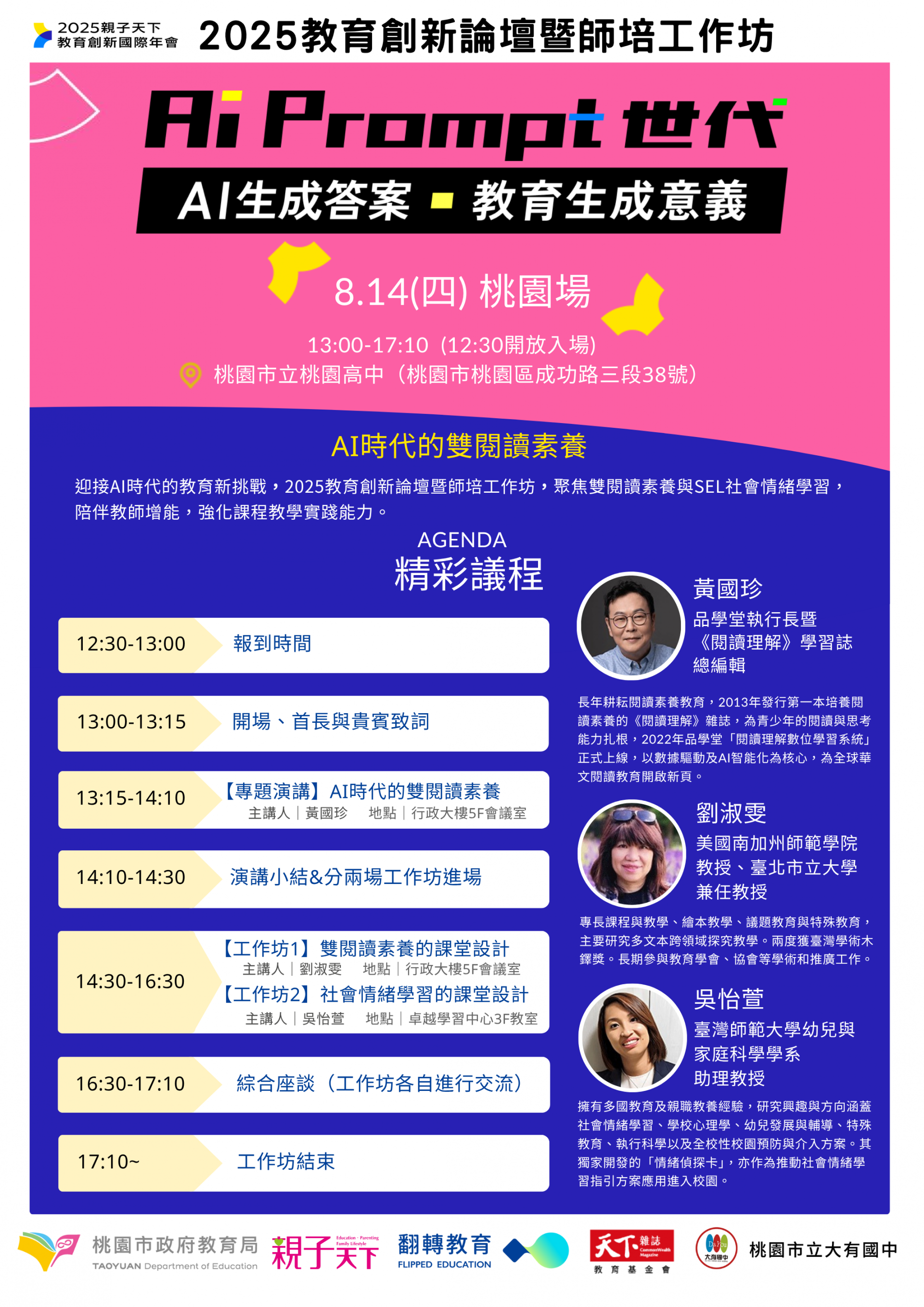 | 1、 | 專題演講:由黃國珍講師(品學堂創辦人)解析雙閱讀素養之發展趨勢與實務應用。 |