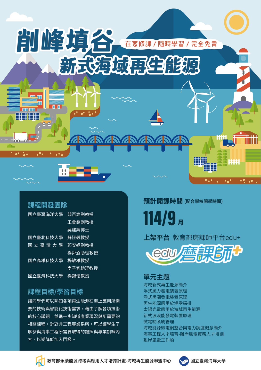 二、 課程內容聚焦於海上再生能源的應用與發展,全面介紹技術需求與智能化挑戰。內容涵蓋海事工程基礎、浮式風機的動態控制技術等,適合對此領域有興趣之相關人員。