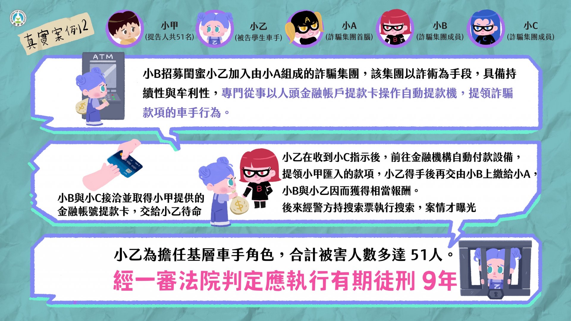 近年來學生擔任車手涉詐欺案件數攀升,尤以 12 至 23 歲涉案最多,教育部藉由真實案例,解析學生擔任詐騙車手所可能承擔的法律責任,製作本案懶人包,避免學生遭不法分子利用,衍生後續的法律風險與責任。