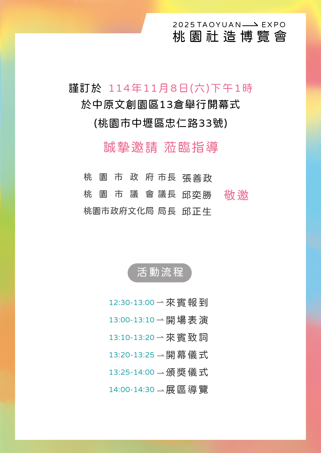 | (一) | 開幕式: 114 年 11 月 8 日(星期六)下午 1 時,活動地點為中原文創園區 13 倉。 |