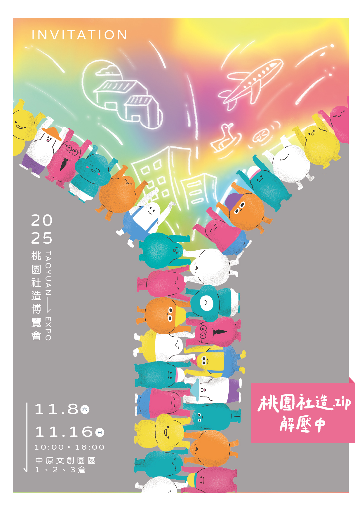 | 一、 | 為呈現桃園市推動社區總體營造成果,邀請各單位夥伴一同體驗桃園社造「解壓縮」的瞬間,一次展開市府跨局處、區公所及社造點等,超過 90 個單位的行動方案與成果,完整呈現桃園文化的流動、交織與共生。 |