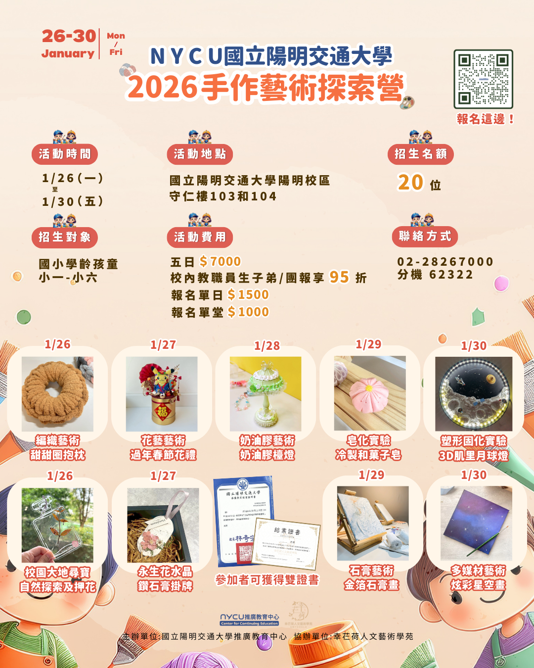 | 一、 | 本校推廣教育中心將於 115 年寒假辦理「2026 手作藝術探索營」5 日兒童課程,引導孩童探索手作藝術創作的樂趣。 |