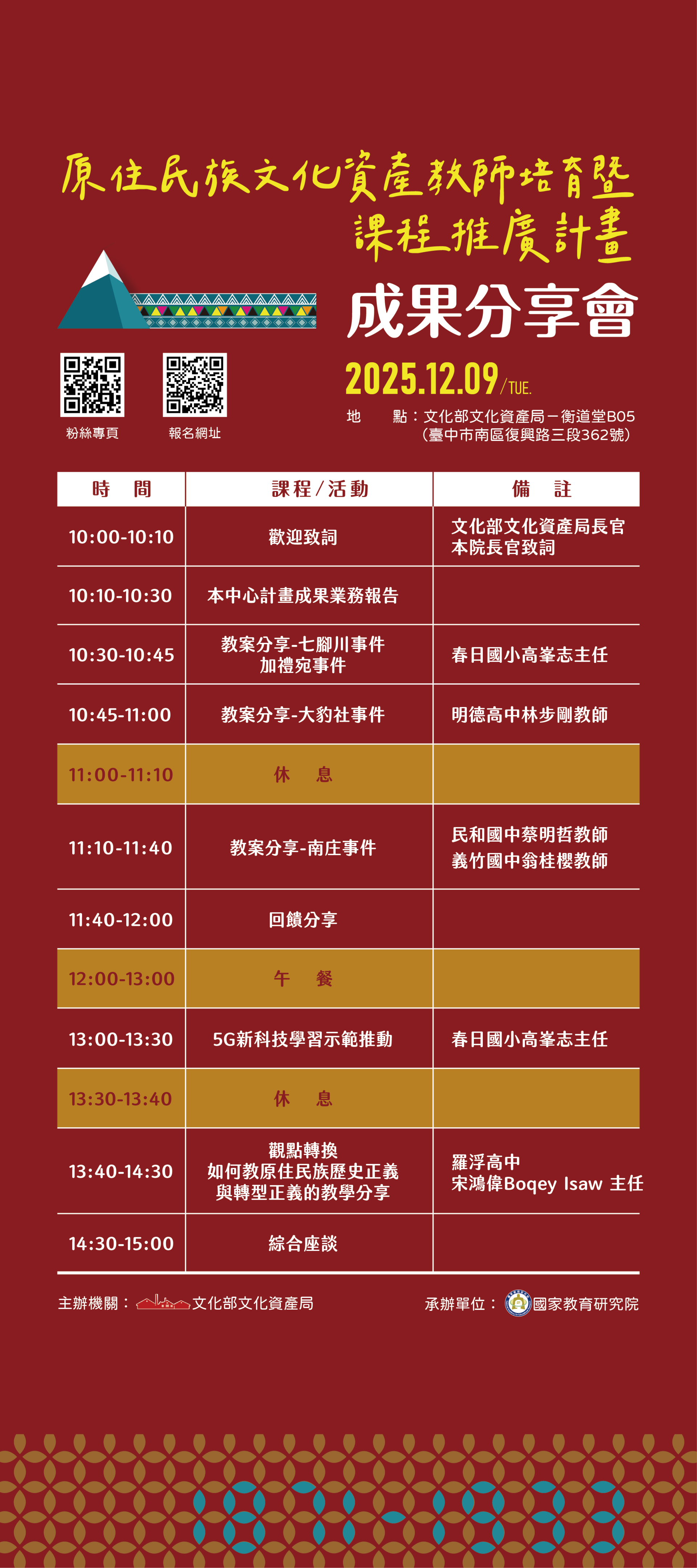 | (一) | 國教院原住民族教育研究中心李先生,聯絡信箱 ibanpito@mail.naer.edu.tw 、聯絡電話: 02-7740-7118 。 |